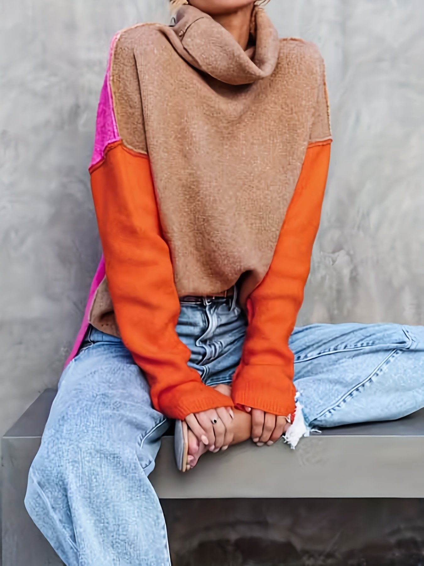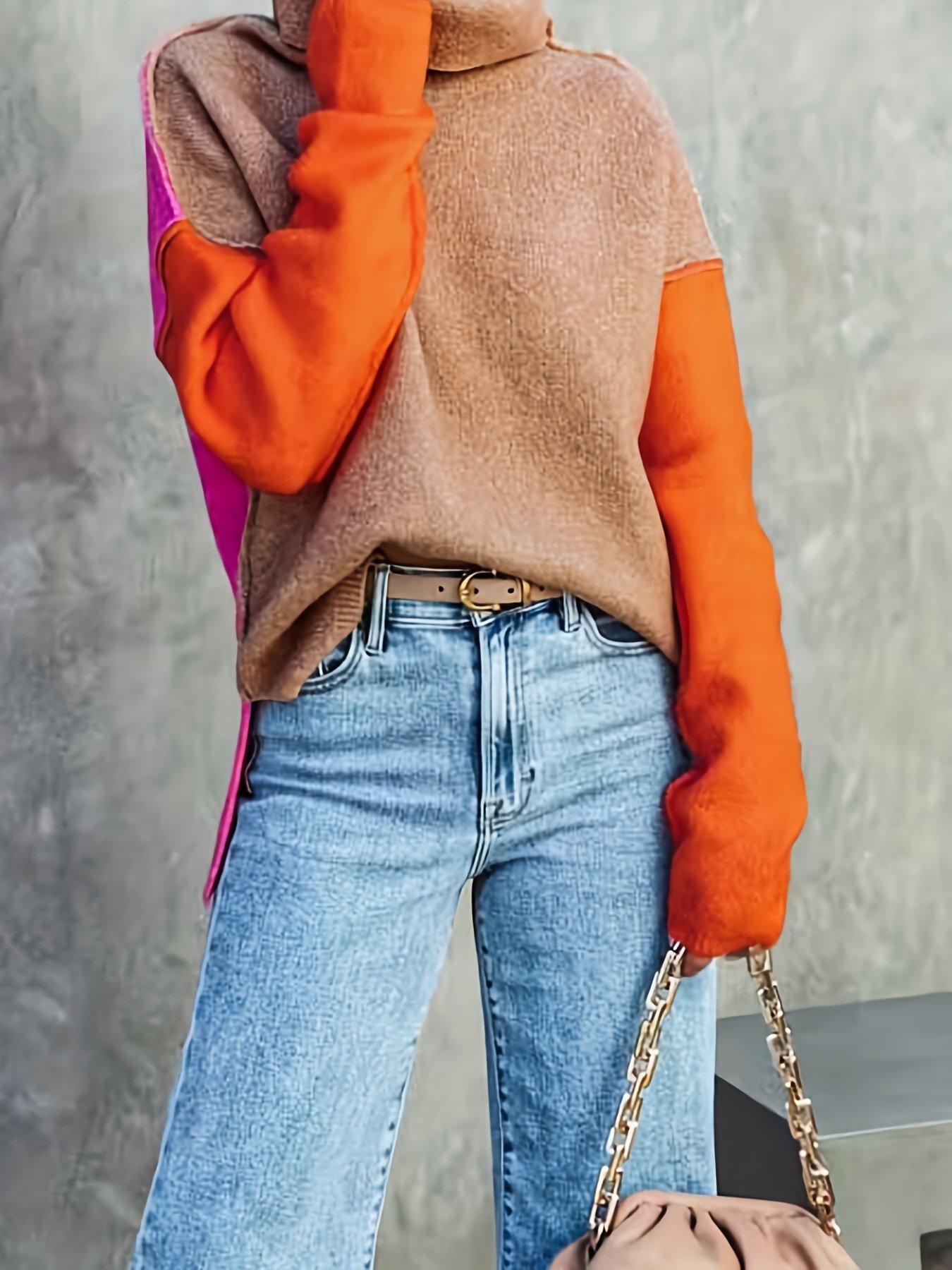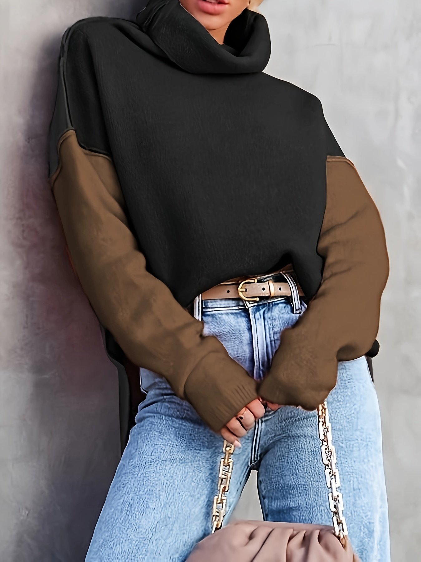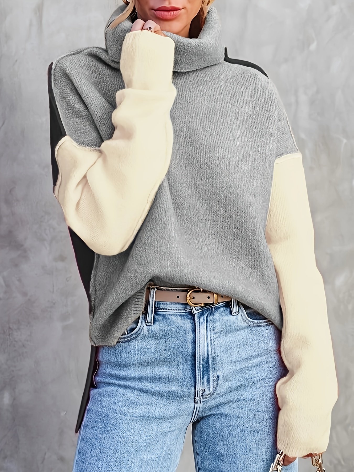 Color Block Turtle Neck Pullover Sweater, Casual Long Sleeve Split Side Sweater For Fall & Winter, Women’s Clothing