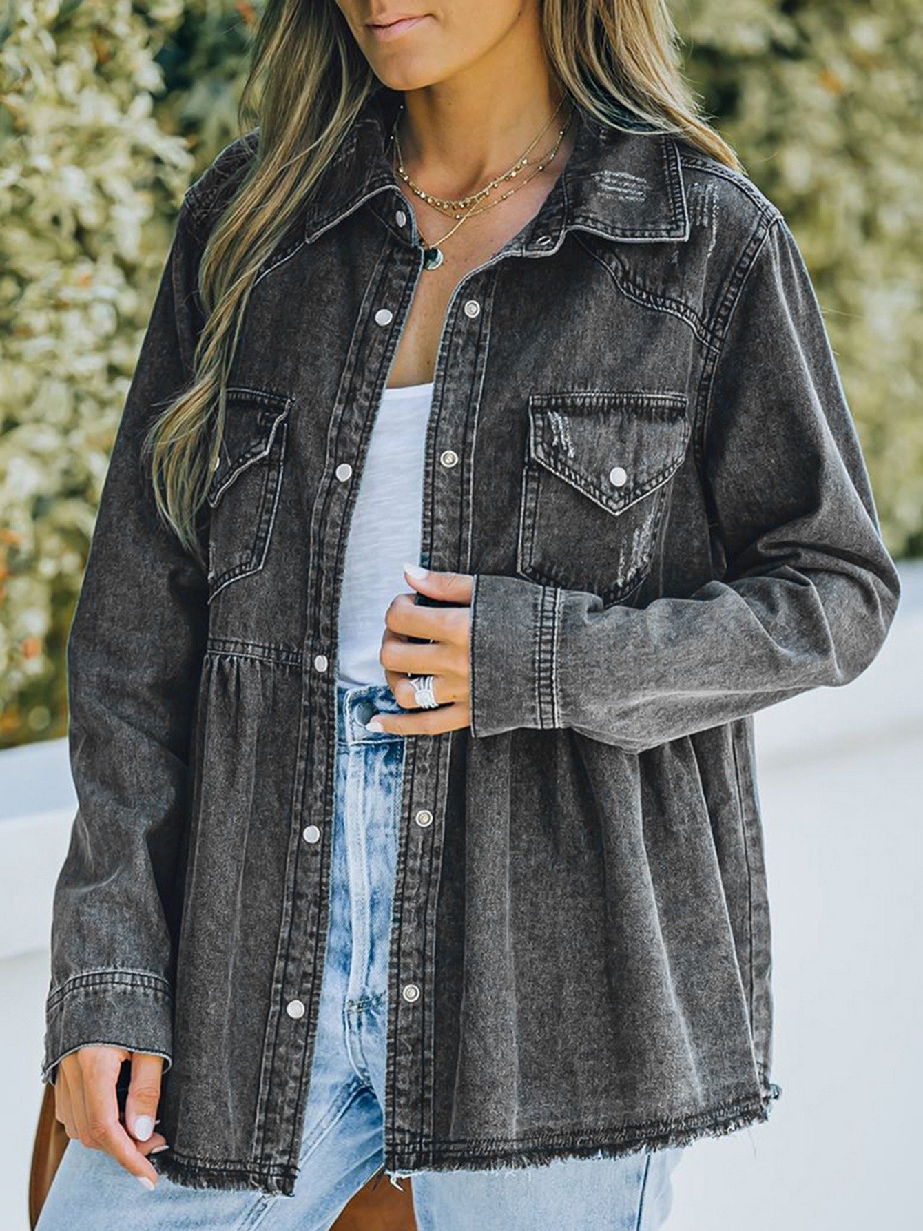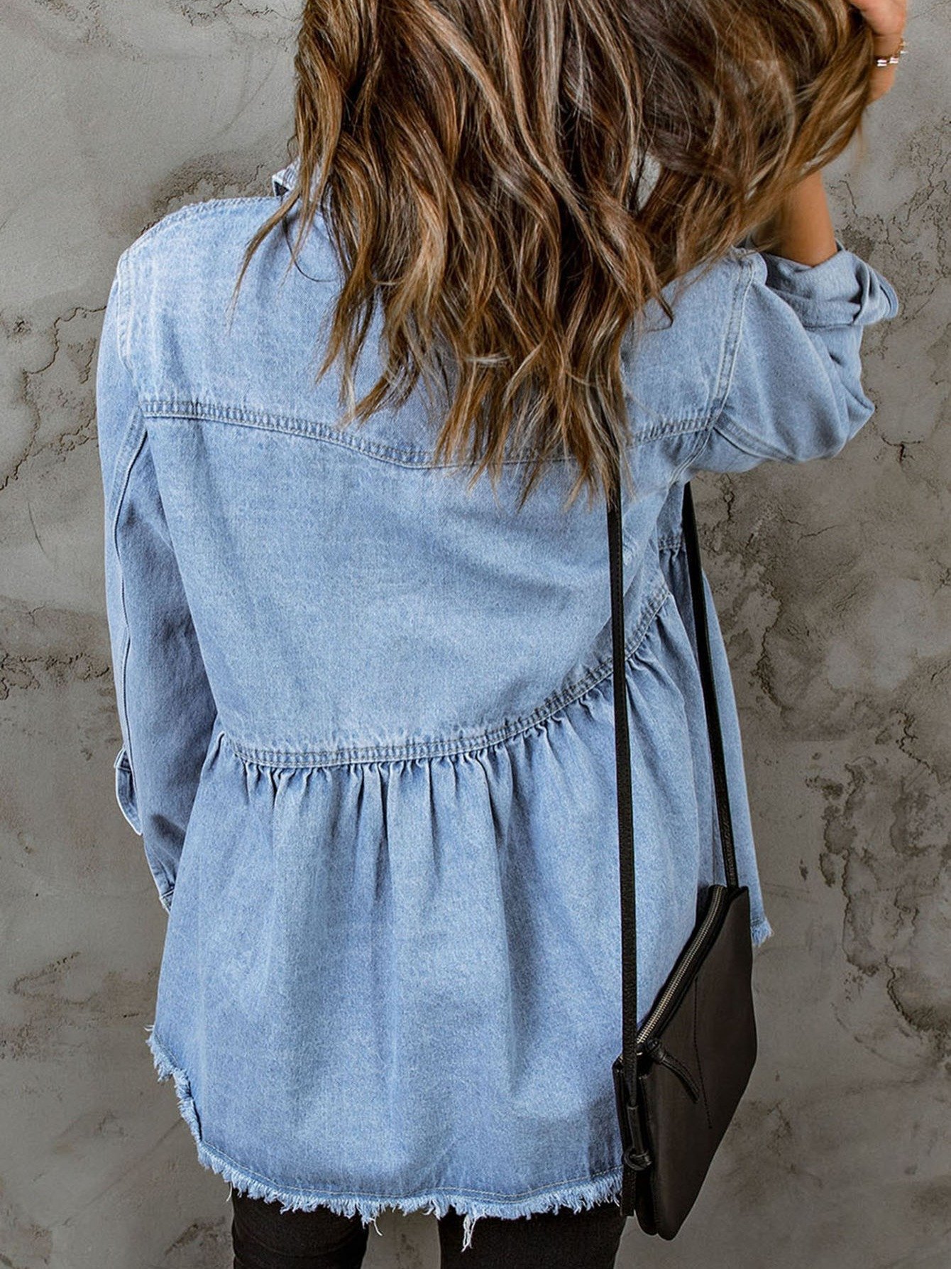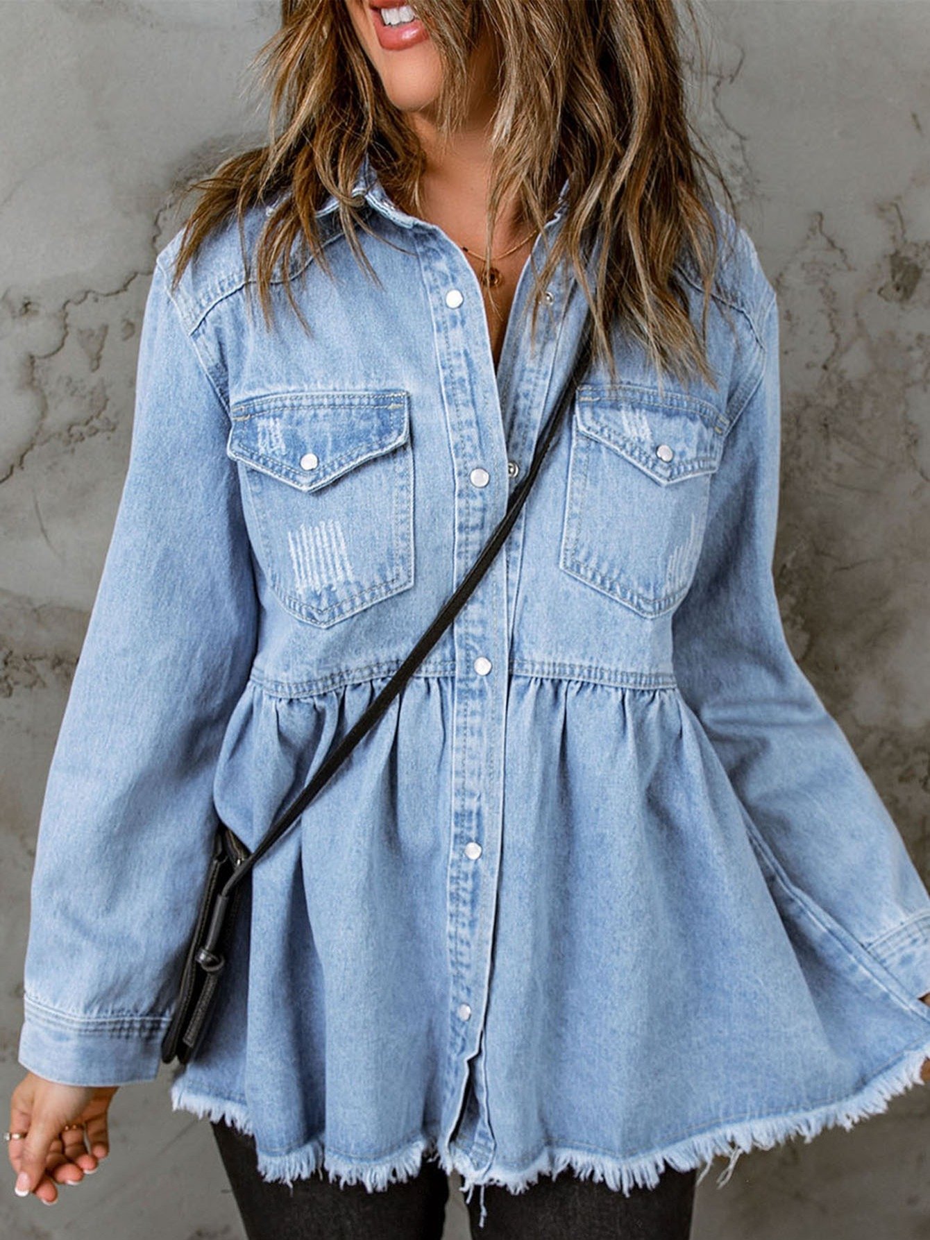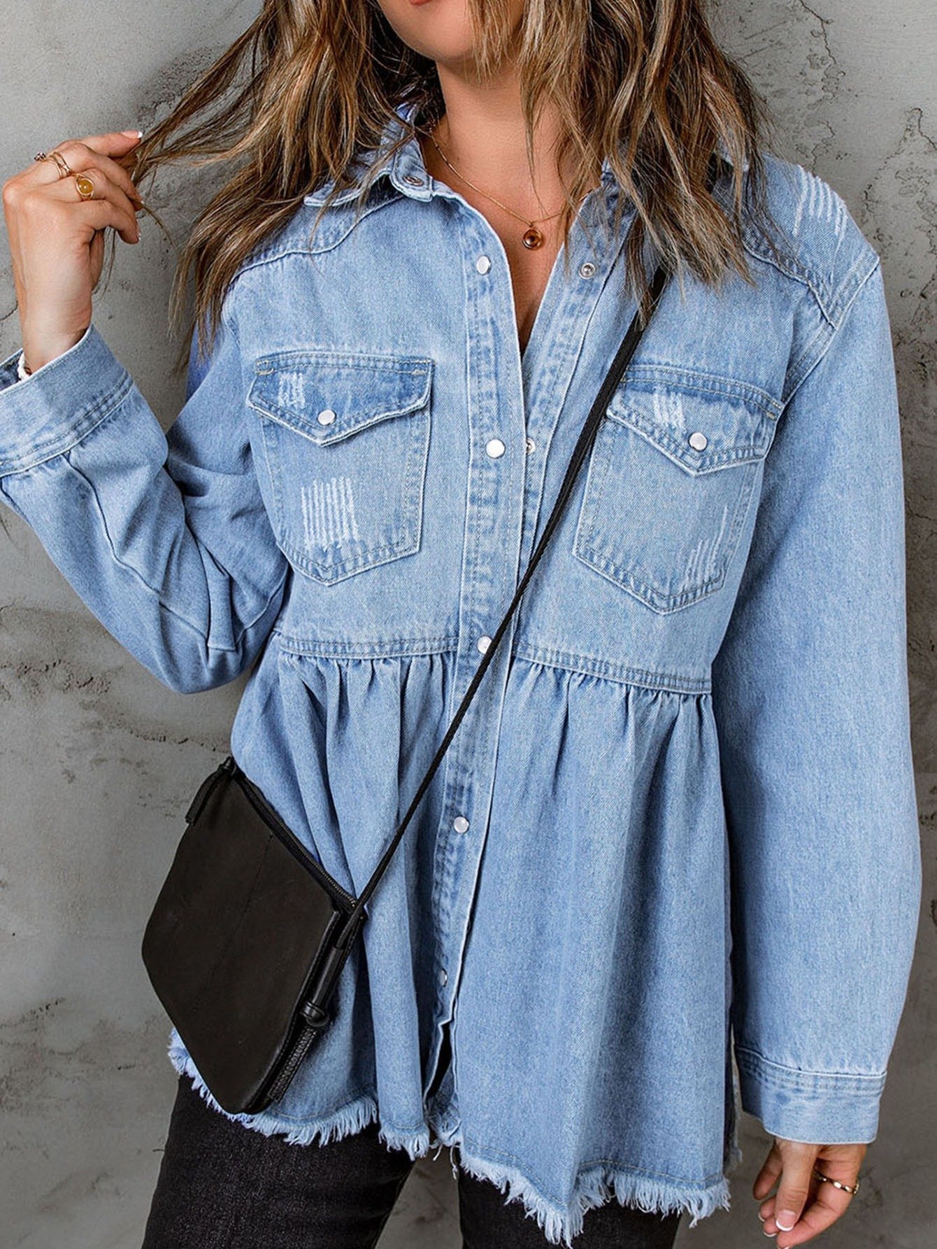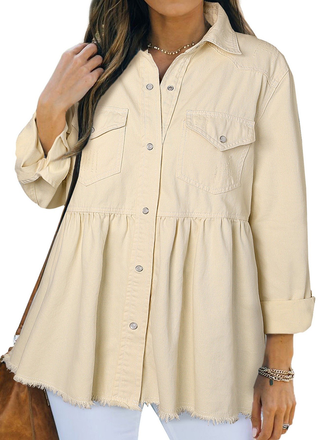 Women’s Casual Long Sleeve Denim Button Down Shirt, Ruffled-Hem Denim Jacket
